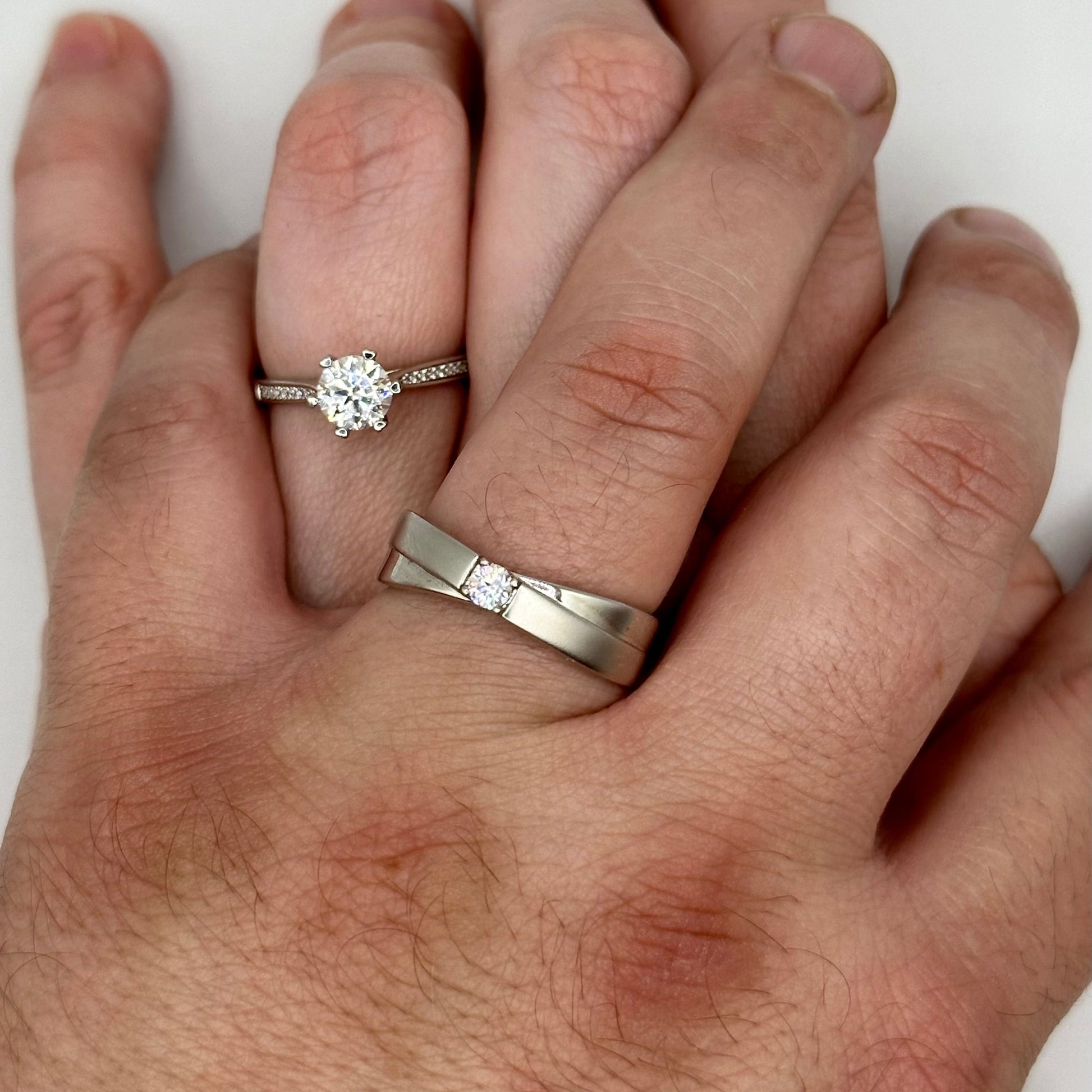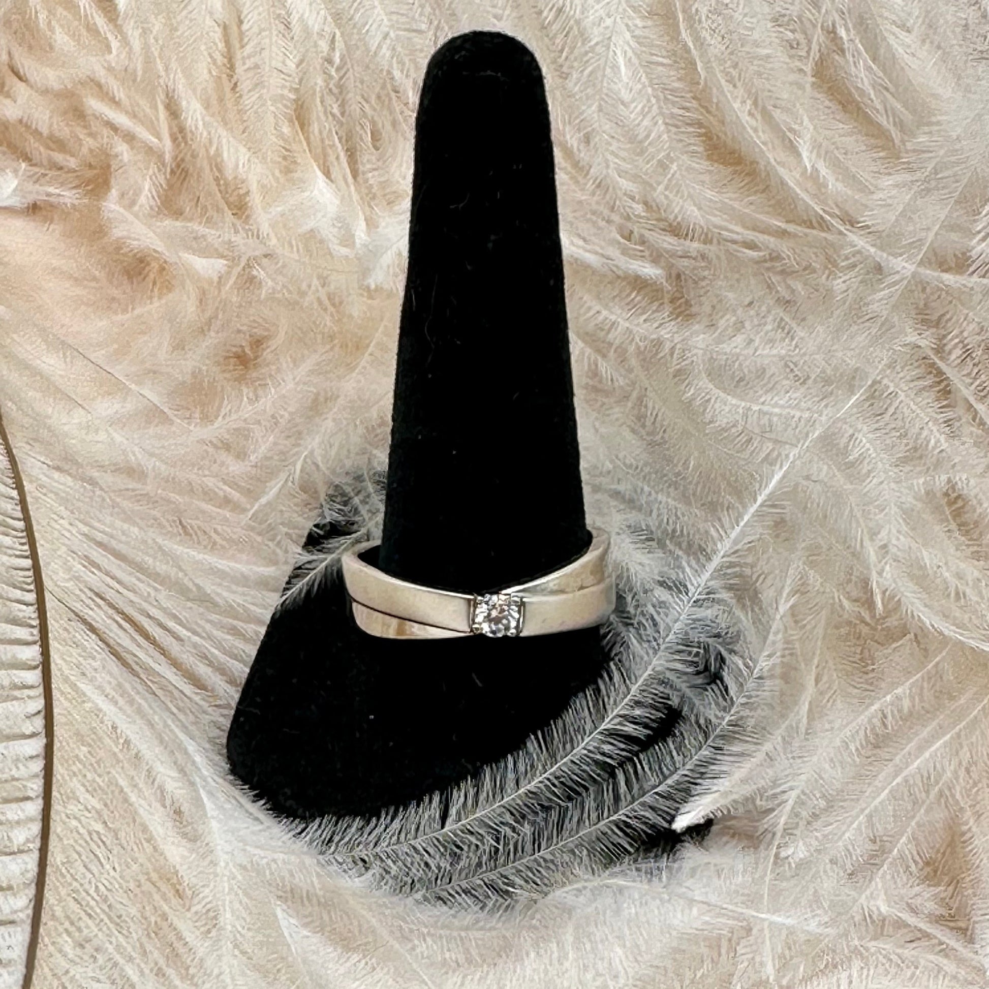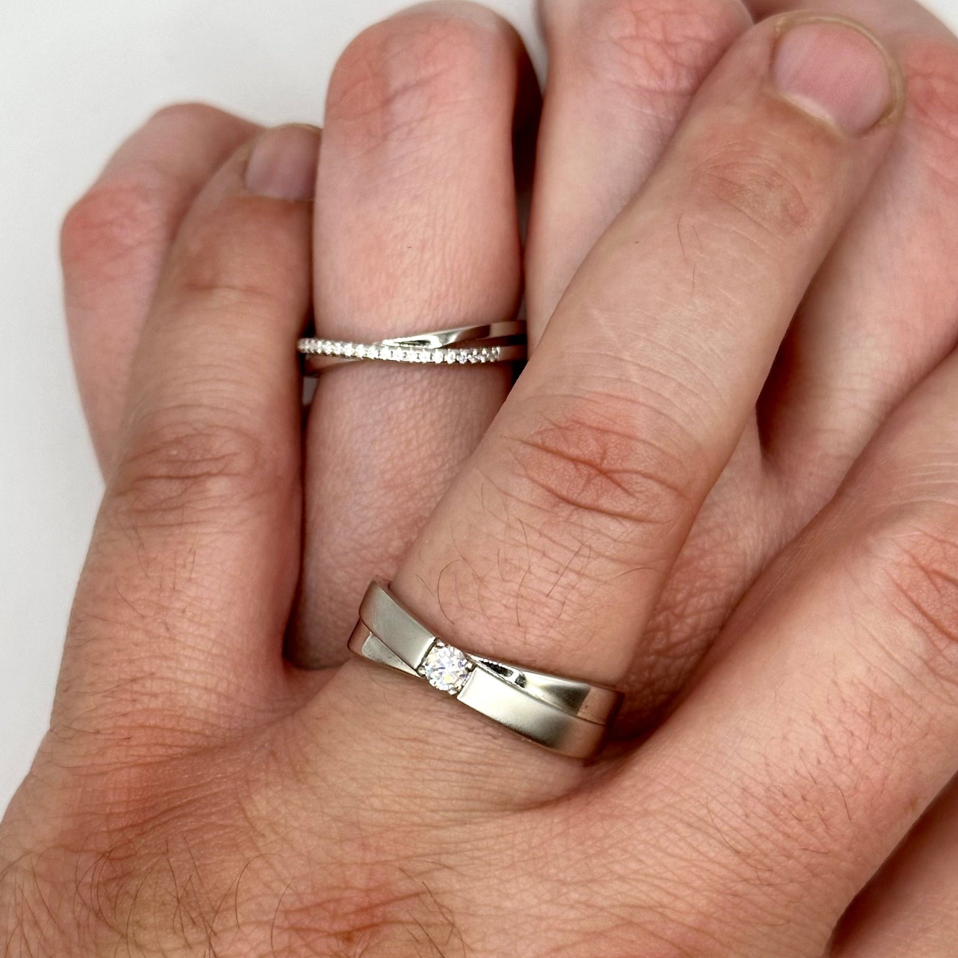 A stylish cross-style band that pairs with the Felisha, the Dylan band contains a single moissanite stone. The stone's brilliant sparkle stands out even more next to the soft satin polish of the band. Set in rhodium plated sterling silver.